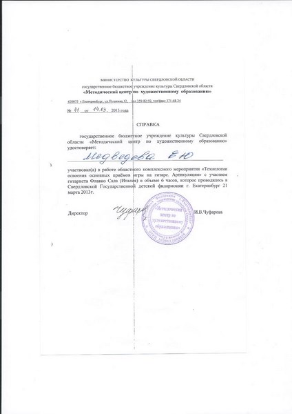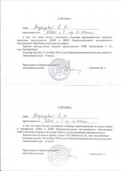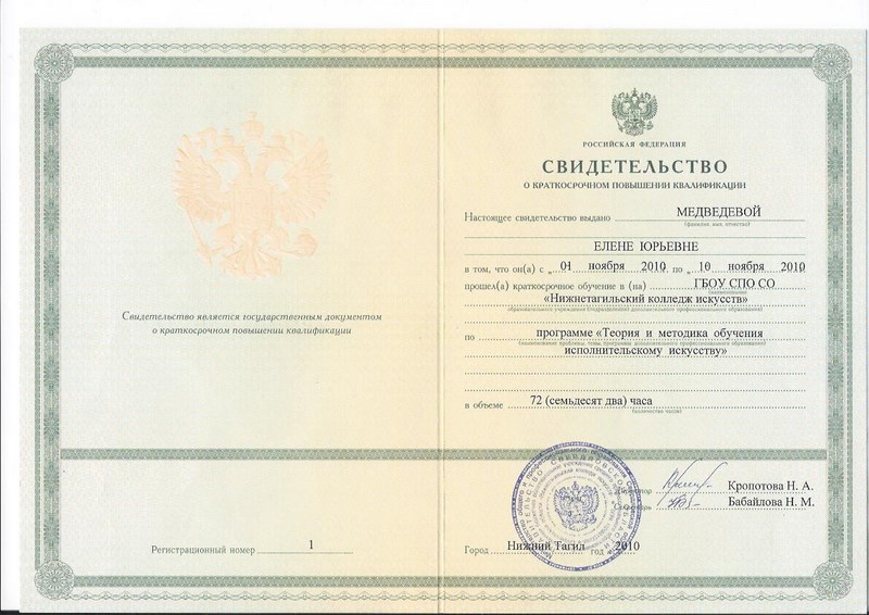 Нижнетагильское музыкальное училище, 1997 год, квалификация – преподаватель, артист оркестра (ансамбля), руководитель творческого коллектива.